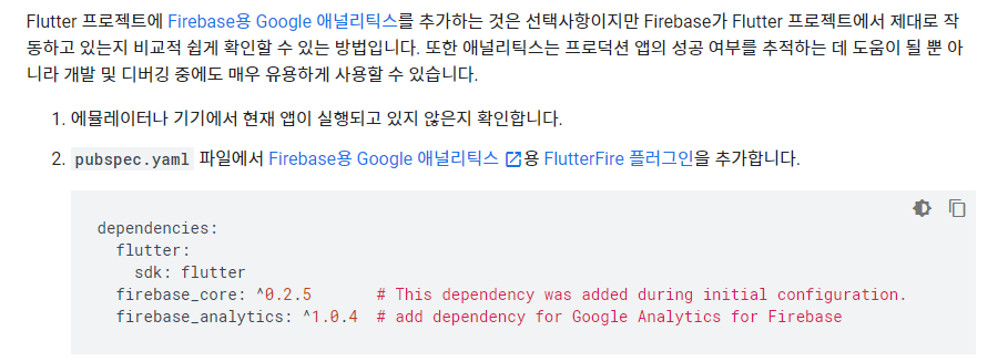 https://firebase.google.com/docs/flutter/setup?hl=ko현재 공식 사이트에서 아래와 같이 설명 하고 있다.