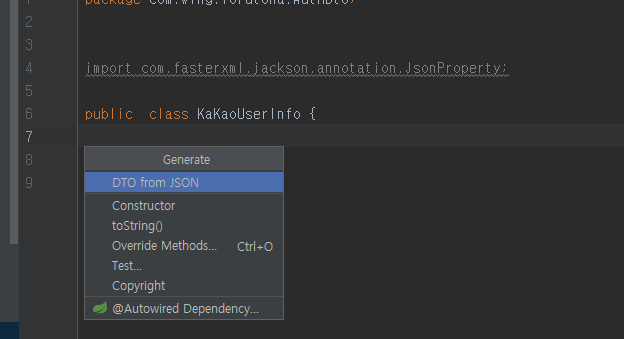 Alt+insert 를 눌러 DTO from JSON 을 눌러 줍니다.