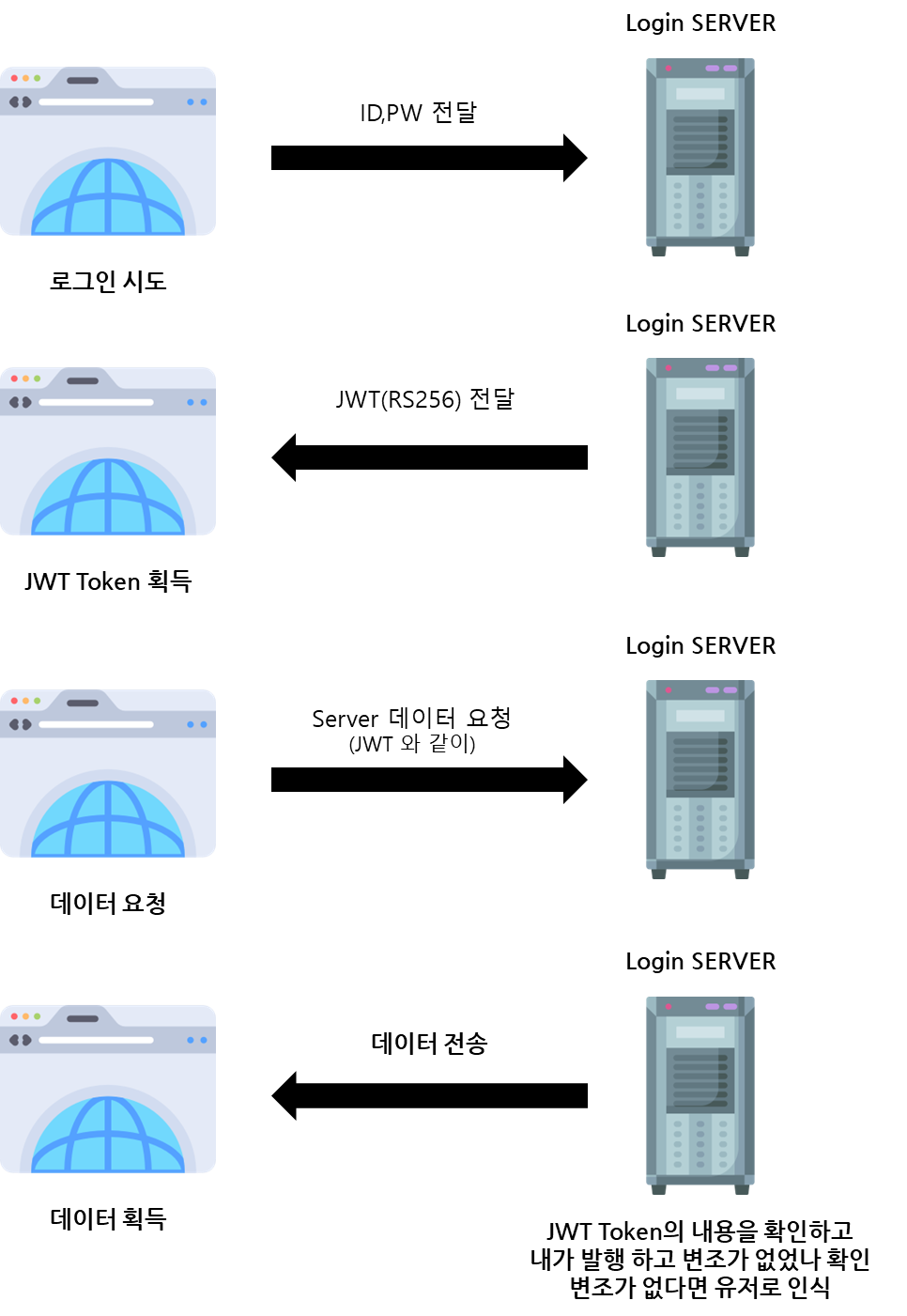 - 다양한 server에 통합 로그인이 필요할때 모두가 SecretKey가 필요 합니다. 다수의 관리작 SecretKey을 알게 됩니다. SecretKey이 유출 되면 JWT 변조가 가능해 지면서 각종 해킹에 노출이 되요.