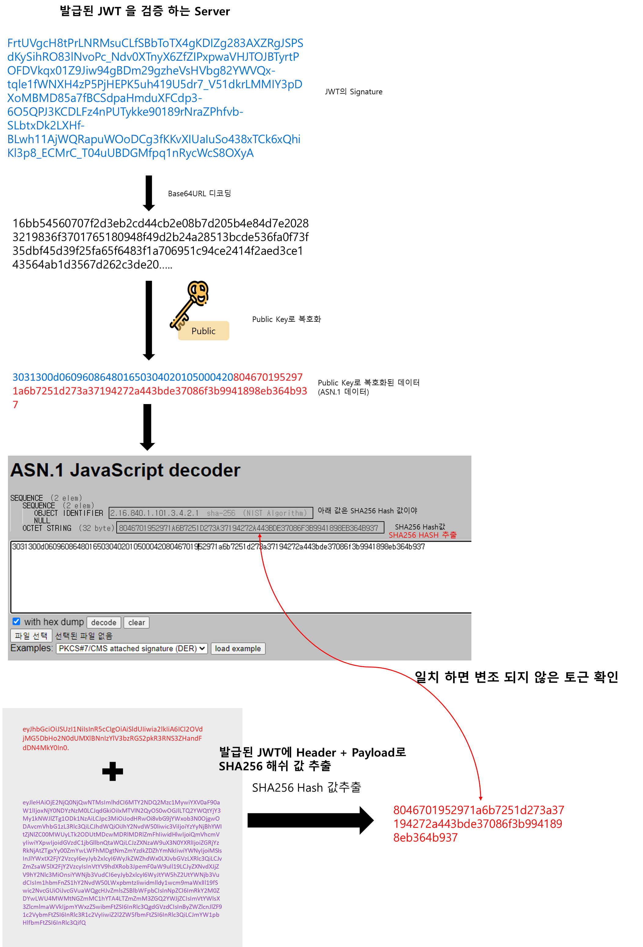 Singature 부분을 복호화 하고 그안에 들어 있는 SHA256 값과 JWT의 haeder+payload 데이터로 얻은 SHA256 값을