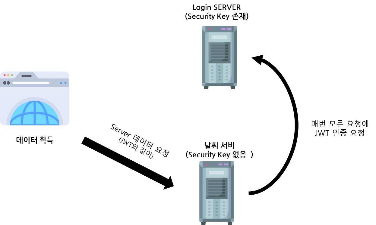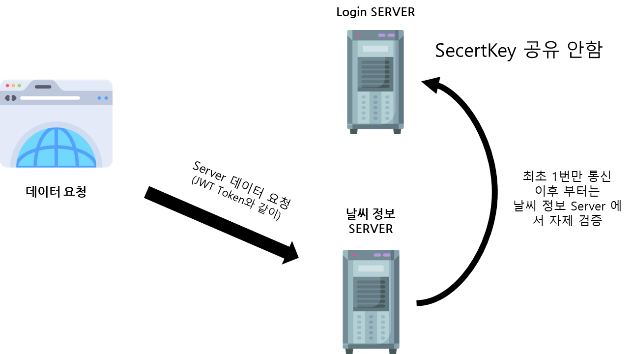 - 만약 1대의 Server에만 SecretKey을 알고 있고 SecretKey 정보가 없는 타 서버 에서는 서버간 JWT 통신을 통해 변조를 확인 한다면 SecretKey가 없는 서버에 요청을 할때 모든 요청에 서버간 JWT 통신을 하게 되는 자원 낭비가 심각해요.