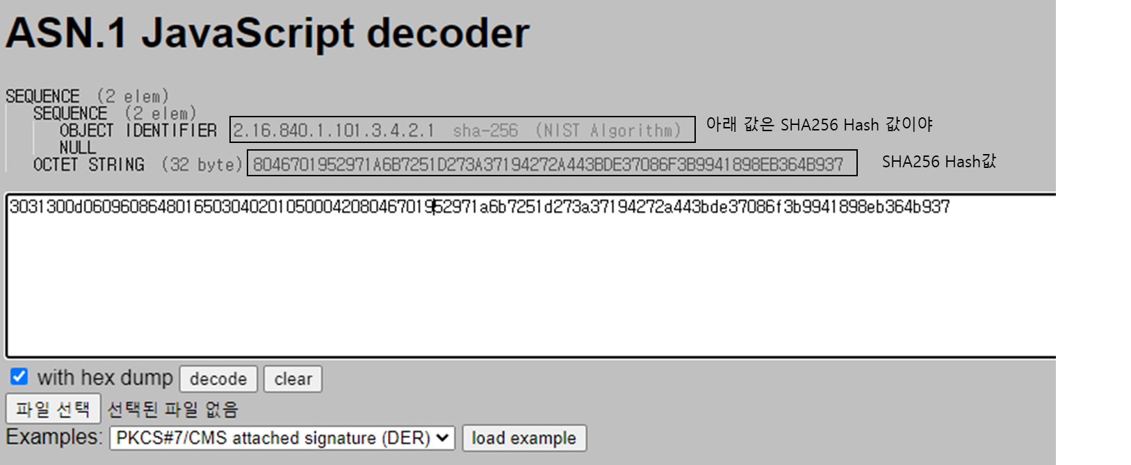 System.out.println("복호회된 안에 있는 SHA256 Hash 값 = " + byteArrayToHex(decodeSig));