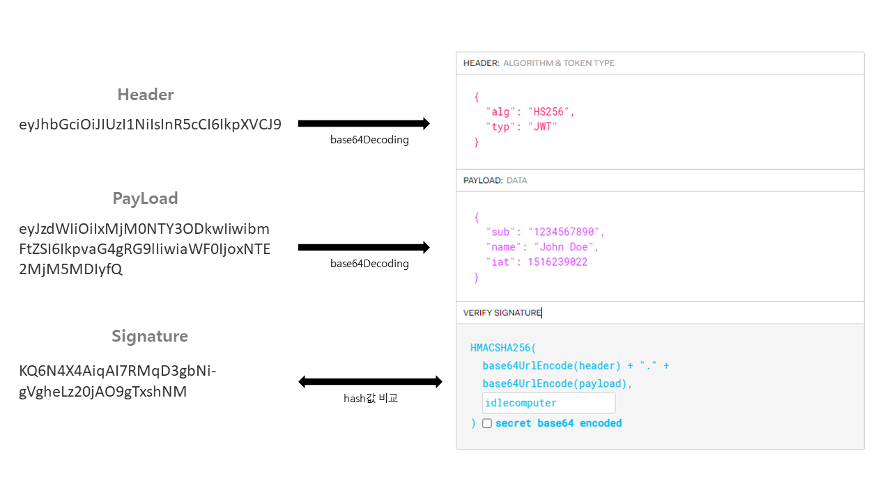 Hash로 나온 값과 JWT의 Signature 부분이 같으면 JWT 토큰이 변조가 없음을 확인 하게 됩니다.