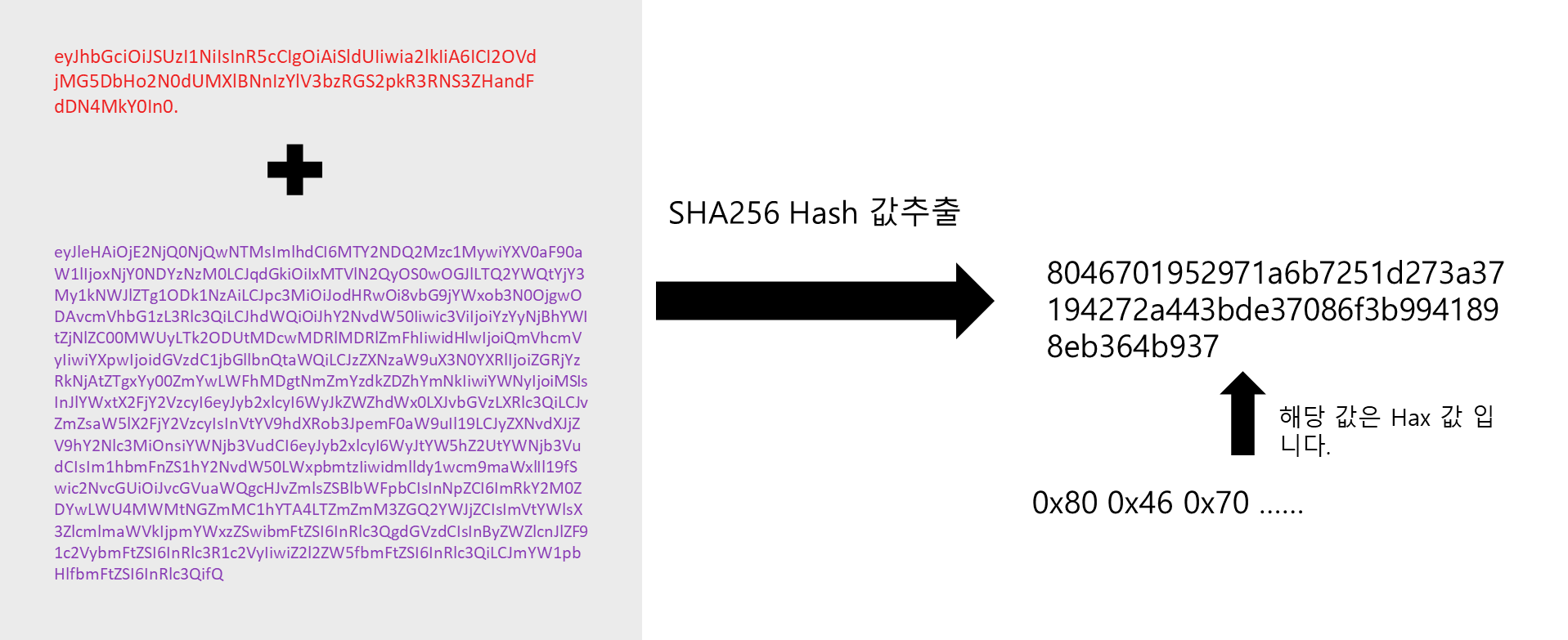 Header와PayLoad으로 계산한 sha256Hash 값 = 8046701952971a6b7251d273a37194272a443bde37086f3b9941898eb364b937